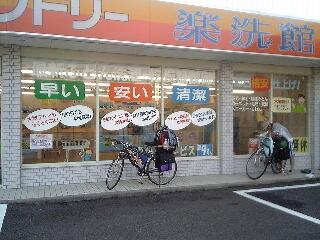 かなりの雨で、私たちはとりあえずその屋根の下へ移動。しかし、屋根の下の土がぬれていたことから、雨が降れば水がたまる場所であることは容易に想像できた。ふとあたりを見回すと、コインランドリーを発見。もう営業は終了していたが、店内の明かりはついていた。それほど広くはなかったが、軒下なら雨を回避できるので、そこで今日は寝ることにした。いつものようにごみぶくろを敷いて、その上に寝袋を敷く。さらに自転車で自分が隠れるようにして、就寝。しかしこんな開放的な場所では落ち着くはずもなく、1:30過ぎまで、何度も寝返りをしながら、高鳴る胸を押さえつつ、床に就いた。
