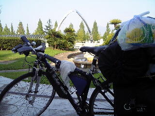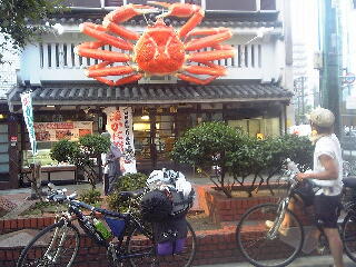 一通り見て、グリコの看板で有名なえびす橋へ。ここの人ごみはすさまじいものがあった。付近を通過する車もお構いなしに人がどんどんと流れ込んできていた。例の看板と自転車を入れた写真を撮る。そこではボーダフォンのお姉さんがうちわを配っていたので、せっかくだからもらってみた。「どこまでいきはるんですか?」と聞かれ、「おぉぉ関西弁そのものだぁ」と感動しつつ、広島まで行くということと、横浜から来たということを話し、その場を後にした。やはり、旅先での会話って楽しいものだ。驚かれる事もあり、その人の昔の経験談を聞くこともあり、反応はさまざまだ。