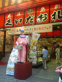 道頓堀にきて何を見たいかというと、かに道楽、えびす橋、くいだおれである。そのくいだおれに行くために、えびす橋から移動する。…といっても、道頓堀のガイドなどもっているはずもなく、えびす橋からどちらの方向に行くべきか全くわからなかった。そのため、さっきうちわをもらったボーダフォンのお姉さんに聞いてみることにした。すると、えびす橋を渡って、左に曲がってしばらく行ったところとのこと。お礼を言い、私たちは早速移動した。