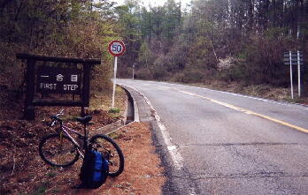 15:20にようやく1合目の看板が見えてきた。ここで記念撮影をして、休憩をとり、再び上を目指す。もうここまでくればひたすら走るしかない。途中、すれ違うドライバーの物珍しそうなまなざしを受けながら、とにかく走っていく。