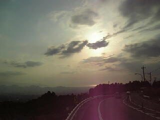 -(左)ひたすら下る (右)遠くに見える海が太陽の光を反射している-