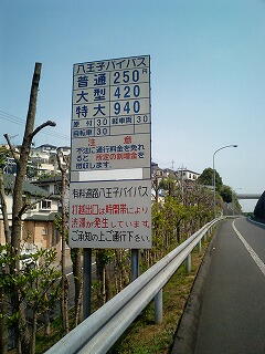-(左)八王子バイパスの料金表 自転車もある (右)八王子市へ-