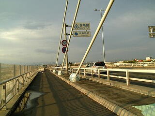 自転車も通行可能なので、アップダウンの激しい一般道を通るよりはいいかと思い、通行料30円を払って走ってみることにした。…とは言っても車道を走れるわけではなく、歩道になるのだが。で、料金所では脇の歩道にポストのような自転車用の料金収受箱があった。ふと財布を見てみると、残念ながら10円玉がない。料金所の収受員に視線を送っても全く反応なし。…仕方なく100円玉を入れて先へ進む。