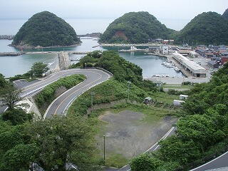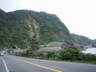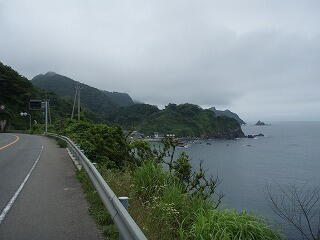 浜坂から諸寄、居組にかけては右手に海、左手に断崖を見ながらの走行である。20〜50m程の軽いアップダウンが続く。居組から先、鳥取県境にかけては物凄い上り坂となった。写真にあるように、走ってきた道が眼下に見えるような急勾配である。地図上の移動はほとんどなく、くねくねと何度もカーブを描きながら走っていく。