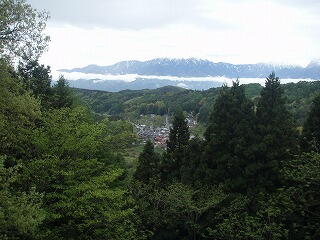-(左)かなりの勾配 (右)集落がはるか下に見える。奥には雪の残る南アルプス(たぶん)-